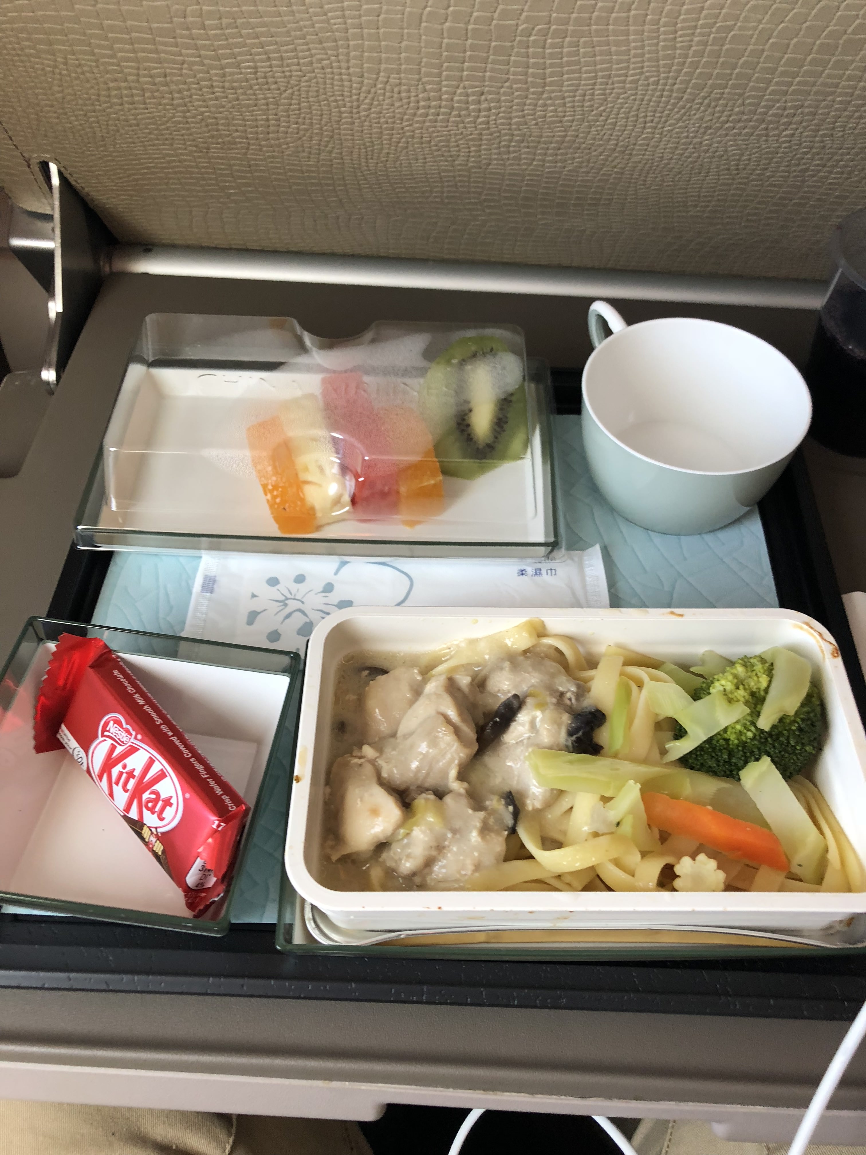 The premium economy seat was a good size, had decent legroom and a big IFE screen so I was definitely catered for. Speaking of catering – the flight attendants began handing out meals not long after take off; I had a chicken pasta dish with veggies as well as a fruit salad and a Kit-Kat – not bad but not the best in-flight meal I’ve had.