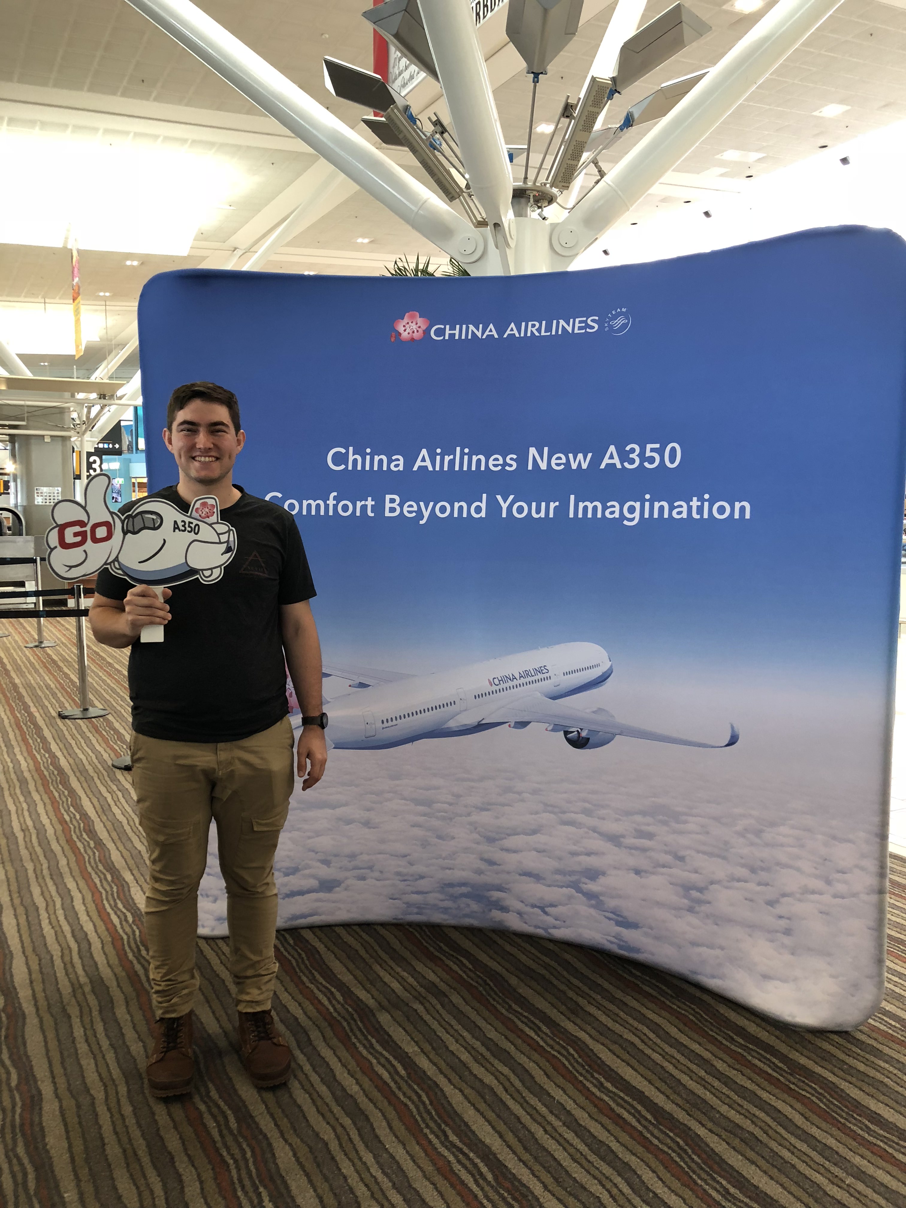 Arriving at Brisbane’s international terminal there was a big poster featuring the A350 and a friendly CI staff member was handing out goodies – I managed to score a China Airlines A350 pen and notepad – not bad. Other than this there was not a lot of fanfare, I headed through security and arrived at the gate to take some snaps of the new aircraft but flight number CI 53 honestly just felt like any other flight from that point.